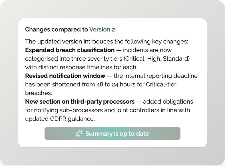 Maintain a single source of truth with full version history and traceability. Track changes over time and always know which document is current.