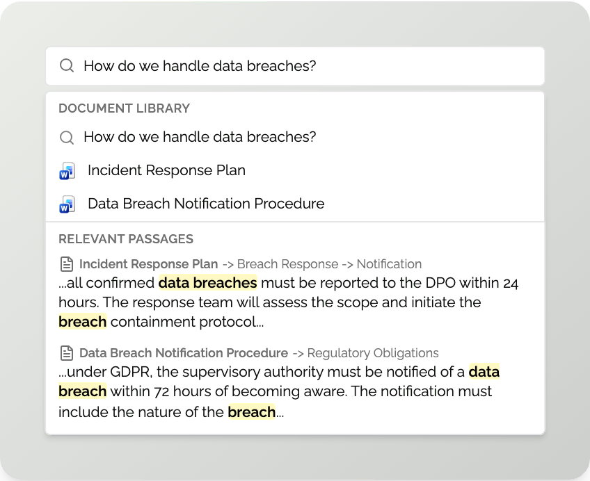 Ask a question and get directly to the relevant guidance. Clear answers reduce misinterpretation, strengthen compliance, and make policies easier to follow in practice.