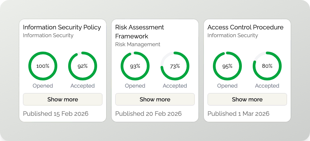Assign clear ownership across policies, guidelines, and controls. Owners are automatically notified of upcoming reviews, ensuring accountability and continuity.