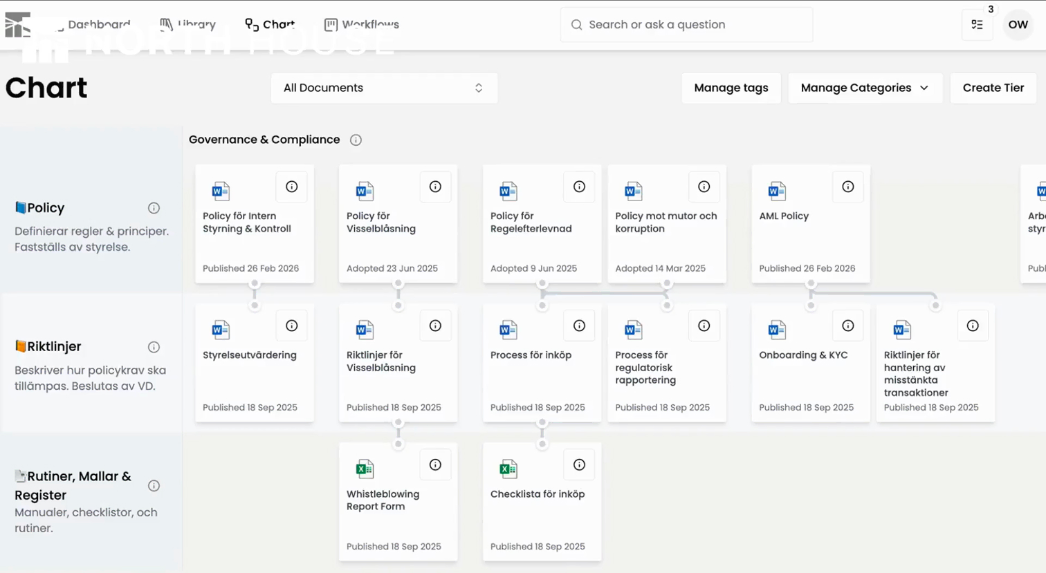 Governance frameworks naturally grow over time, becoming harder to manage, maintain, and align across the organisation. Documents multiply, ownership blurs, and control weakens. North House solves that complexity with structure, clarity, and built-in oversight – granting both immediete relief and long term resilience.